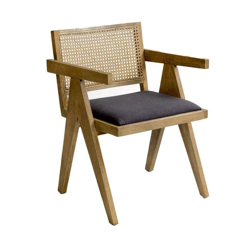 ARTHUR ist ein Stuhl mit Struktur in Eiche natur, Gitterrückenlehne und Sitz mit dunklem Leinen gepolstert. Ein Design mit geraden Linien, das Charakter und Persönlichkeit in den Raum bringt.