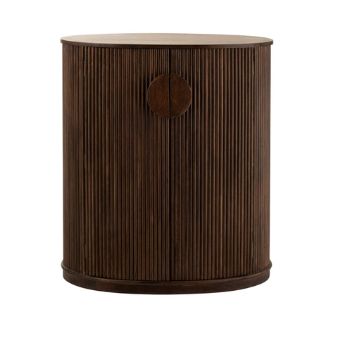 REYI ist ein ovaler, dunkelbrauner Schrank aus Mangoholz. Die Klappen und Wände von REYI bestehen aus dicht aneinander gelegten Holzstäben. Der geschlossene Schrank hat innen 3 Fächer.