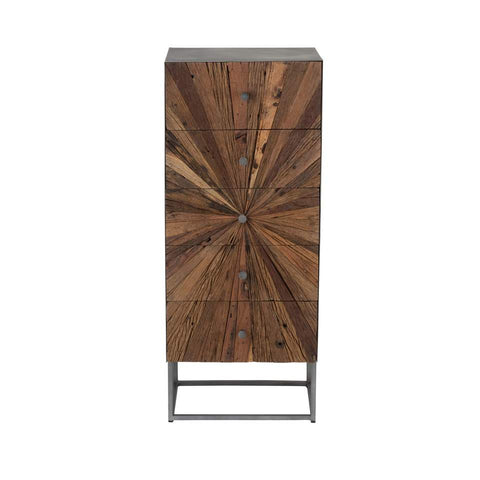 SHANIL ist eine Holzkommode mit 5 Schubladen und einem Metallgestell. Die Seitenteile der Kommode sind grau gefärbt und die Front zeigt eine zentrifugale Fertigung aus Holz.