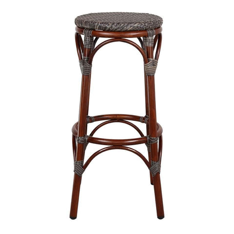 PRAGA ist ein Hochhocker im Bistro Stil mit Aluminiumgestell aus Bambusimitat. Der Hocker PRAGA hat einen geflochtener synthetischer Kordelsitz.