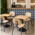 Der Colmar verbindet Funktionalität mit einer modernen, frischen Optik. Seine Sitzfläche und Rückenlehne bestehen aus HPL-beschichtetem Sperrholz in Naturfarbe, das sich durch hohe Widerstandsfähigkeit und pflegeleichte Eigenschaften auszeichnet. Das Metallgestell in kräftigem Blau setzt einen markanten Akzent und verleiht dem Stuhl Charakter, ohne aufdringlich zu wirken.