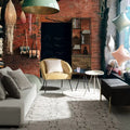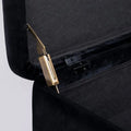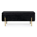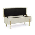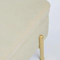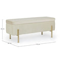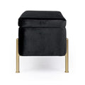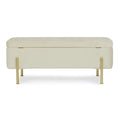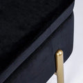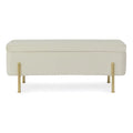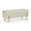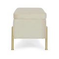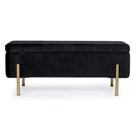 Die goldlackierten Stahlbeine sorgen für einen Hauch von Luxus und bieten gleichzeitig stabilen Halt. Im Inneren verbirgt sich ein großzügiger Stauraum, ideal für Decken, Kissen, Zeitschriften oder andere Alltagsgegenstände.