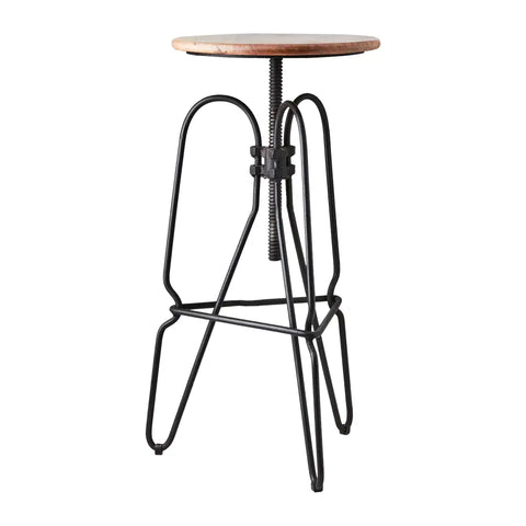 WILLIAM ist ein höhenverstellbarer Hocker im Industriestil mit einer Holzplatte und einem Metallgestell.