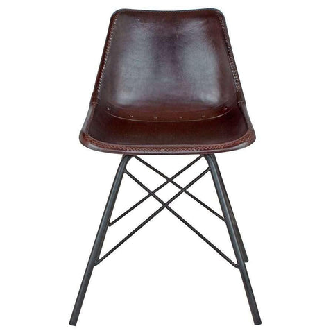 CAMELOT ist ein Stuhl im Industriestil mit schwarz lackiertem Stahlrohrgestell und PP-Sitz, gepolstert mit dunkelbraunem Leder.