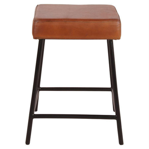 Hocker im Industriestil mit pulverlacklackiertem Stahlgestell und handgenähtem Ledersitz.
