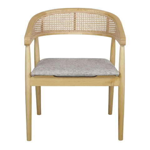 Der Sitz ist mit Stoff gepolstert und die Rückenlehne besteht aus Geflecht.