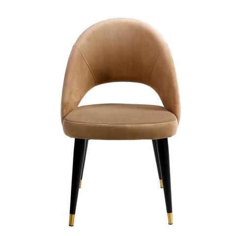 HEDORA ist ein Samtstuhl mit Holzbeinen und Goldfinish. Eine Ästhetik, die dank der intensiven Farbe ihrer Oberfläche Räume mit eigener Persönlichkeit schafft.