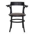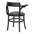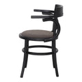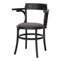 Der gepolsterte Sitz ist mit einem fein strukturierten Stoff bezogen, der angenehmen Komfort bietet und optisch einen dezenten Kontrast zum dunklen Holz bildet. Durch diese Kombination entsteht ein ausgewogener Gesamteindruck, der sowohl funktional als auch ästhetisch überzeugt.