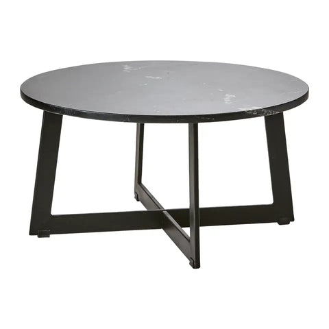 MILA ist ein Tisch mit einer Platte aus schwarzem oder weißem Marmor und einem schwarzen Metallgestell.