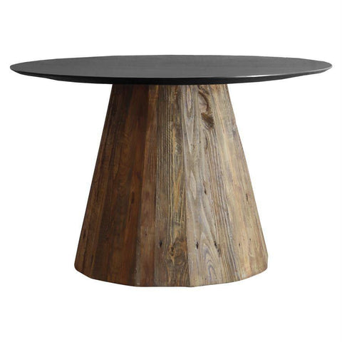 STEFFY ist ein runder Tisch im nordischen Stil mit Struktur aus recyceltem Kiefernholz und Sperrholzplatte mit abgeschrägter Kante, schwarz pulverbeschichtet.