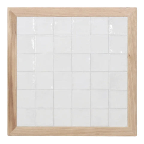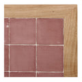 Die Tischplatte Micaela besteht aus einem Rahmen aus massivem Kastanienholz und einer Oberfläche aus keramischen Fliesen im Format 10 × 10 cm, die sorgfältig in das Holz eingelassen sind. Diese Materialkombination verbindet die natürliche Ausstrahlung von Holz mit der Widerstandsfähigkeit und Pflegeleichtigkeit von Keramik und eignet sich besonders für mediterrane und rustikale Tischkonzepte.
