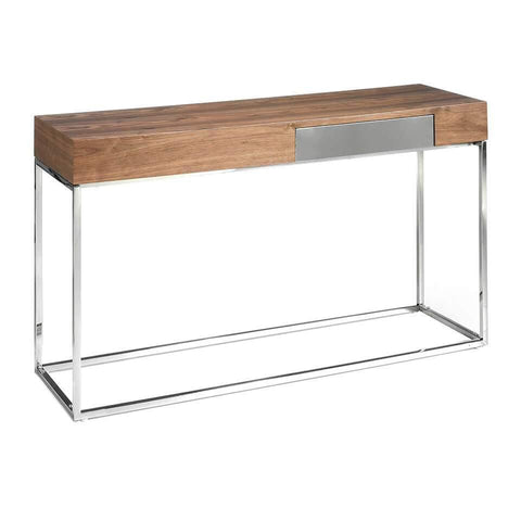 Konsole mit modernem Design und rechteckiger Oberseite aus 0,5 mm dickem Naturnussfurnier. Die ursprüngliche Struktur der Beine aus verchromtem Edelstahl mit 21 Mikron ist eines der Schlüsselelemente, die in seinem Design hervorgehoben werden müssen. Eine perfekte Konsole, um Licht und Avantgarde in Ihren Eingang oder Ihre Halle zu bringen und dank der seitlichen Schublade mit Drucköffnungssystem und weich schließendem Verschluss mit einer Front aus 21 Mikron verchromtem Edelstahl alles sauber zu halten.