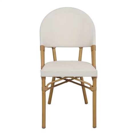 Die Sitzfläche und die Rückenlehne des Bistrostuhls KONRAD sind aus beigefarbenem Stoff gefertigt.