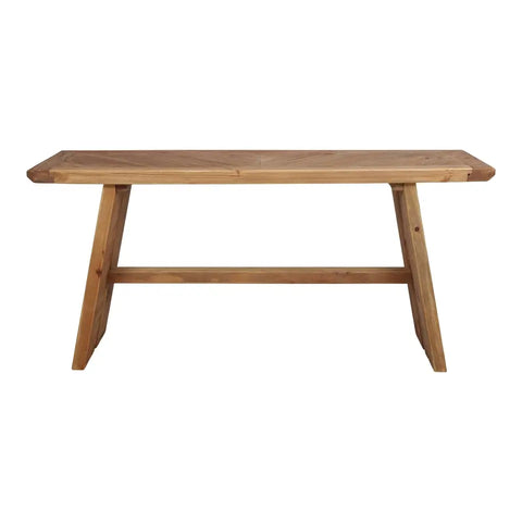 LIKEN ist eine rechteckige Konsole im rustikalen Stil aus massivem recyceltem Kiefernholz mit unterer Querstange und Platte mit Fischgrätmuster.