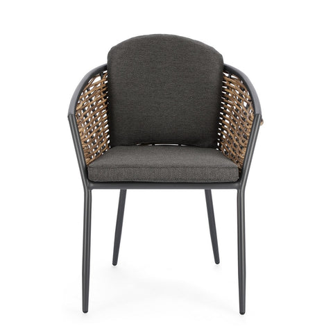 MARIBELA ist ein Gartenstuhl aus synthetischem Rattan und hat ein schwarz pulverbeschichtetes Aluminiumgestell.