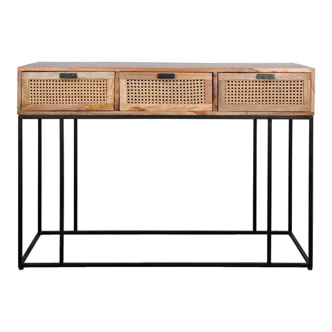 MOSCOBAL ist eine Holzkonsole aus massivem Mangoholz und enea Gitter mit 3 Frontschubladen.